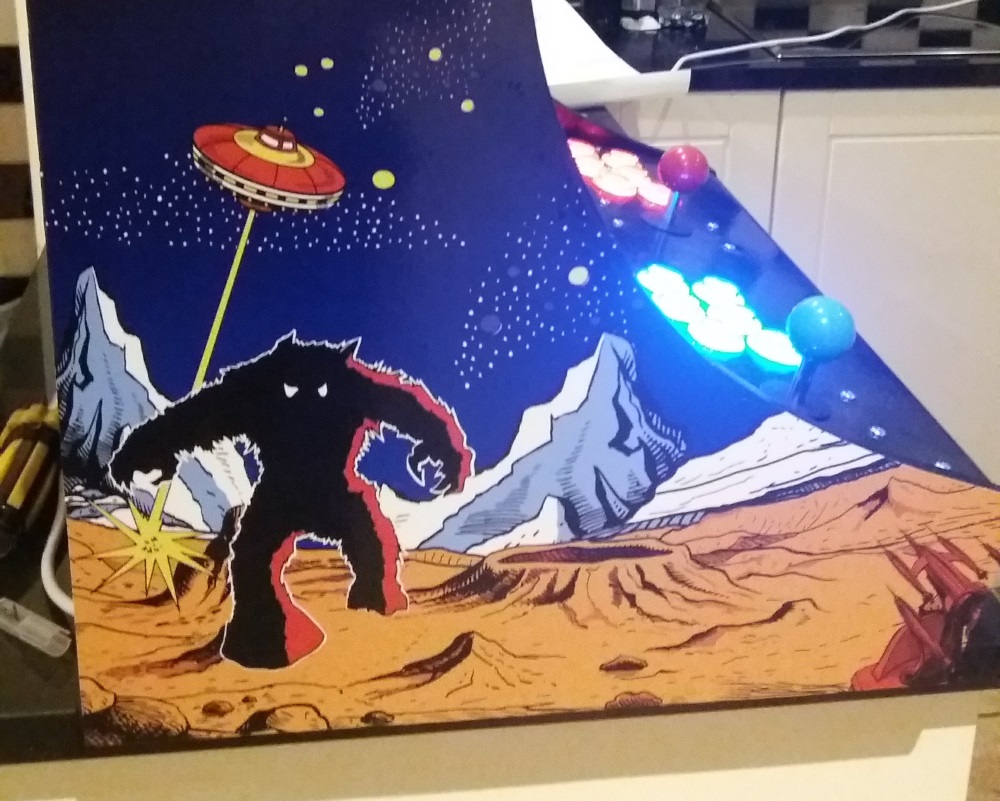 I wanted some classic arcade artwork. I used a company call Rock Star Print. I told them what I wanted and gave them the dimensions. The artwork was printed on heavy duty vinyl and the end result was brilliant. I put the vinyl on the sides which I had already painted black. If I were to do it again, I'd leave the sides white or a light colour as this would produce more vivid colours on the vinyl.